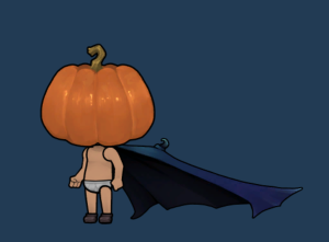 Punk’n Head stands in town during the month of October, also known as “Spooky Month”. He only wears a pair of shoes, white briefs, a cape, and a large Punk’n on his Head. The head gear resembles the powerful seasonal item that shares his name, Punk’n Head.